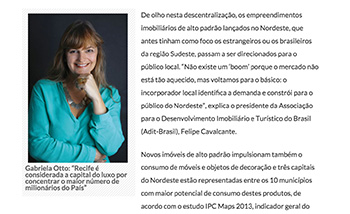 De olho nesta descentralização, os empreendimentos imobiliários de alto padrão lançados no Nordeste, que antes tinham como foco os estrangeiros ou os brasileiros da região Sudeste, passam a ser direcionados para o público local. “Não existe um ‘boom’ porque o mercado não está tão aquecido, mas voltamos para o básico: o incorporador local identifica a demanda e constrói para o público do Nordeste”, explica o presidente da Associação para o Desenvolvimento Imobiliário e Turístico do Brasil (Adit-Brasil), Felipe Cavalcante.